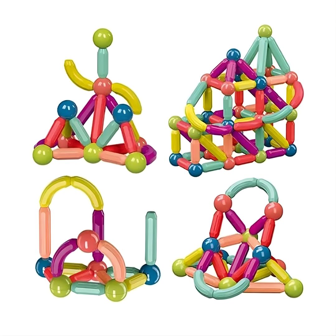 - Barras rectas, curvas y esferas con imanes de alta potencia para crear estructuras firmes y estables.