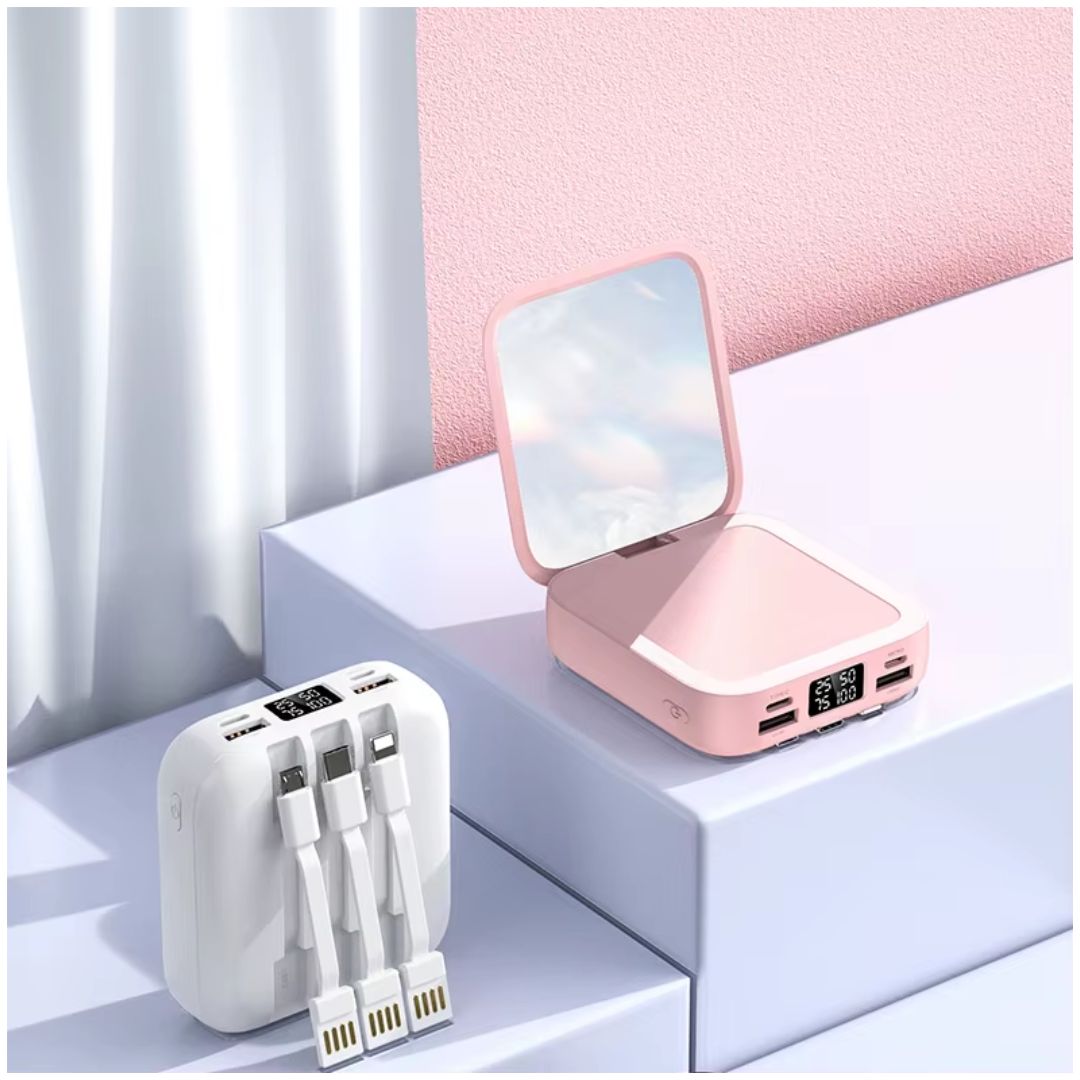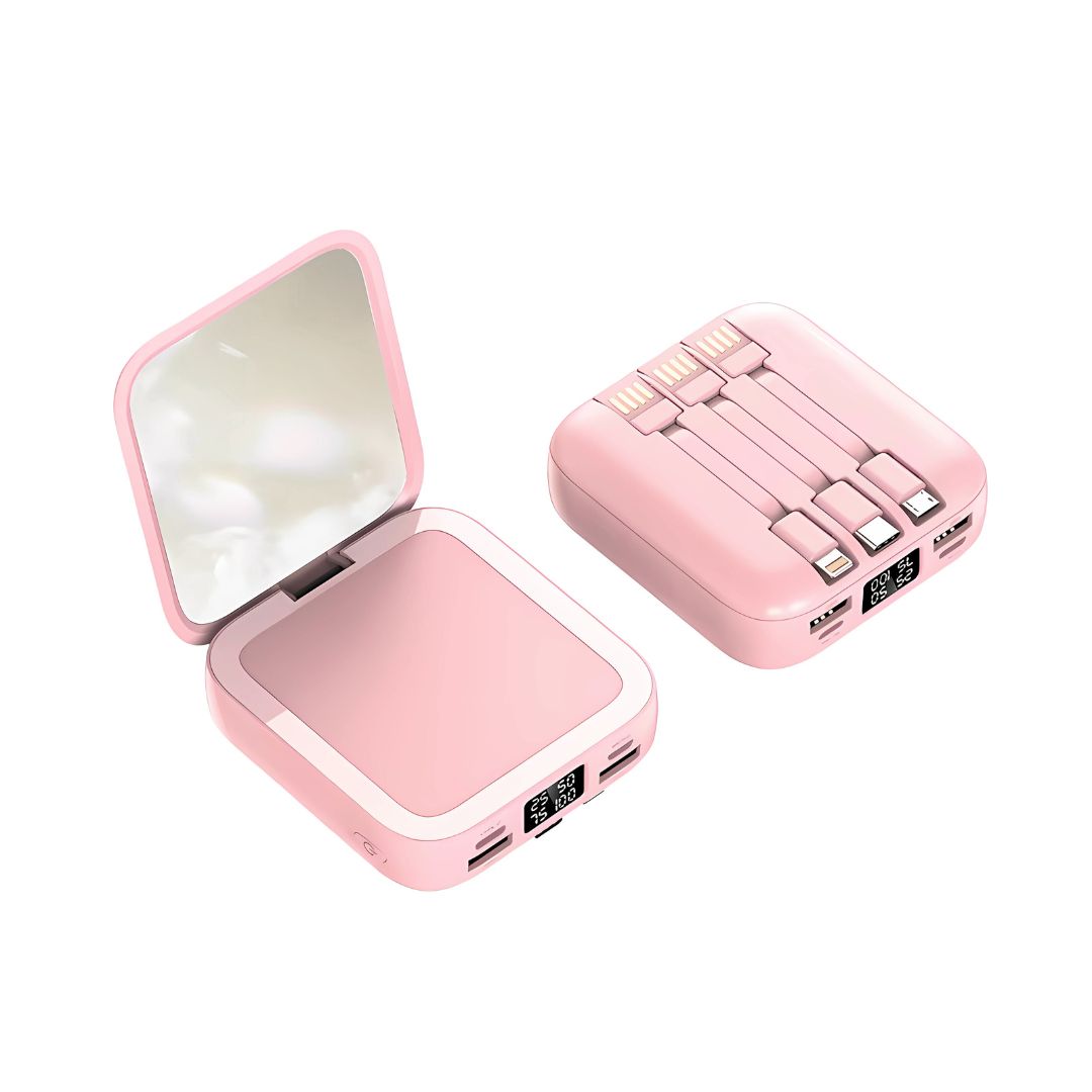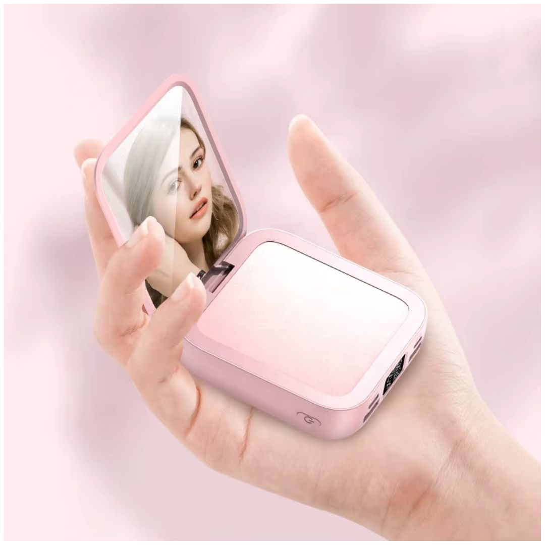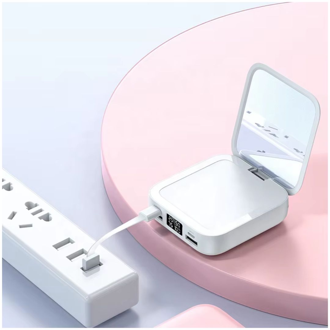 - Este no es un cargador cualquiera: es un Power Bank inalámbrico de 9000mAh con espejo integrado, pensado para mujeres modernas que quieren estar conectadas y radiantes en todo momento. Estilo y energía siempre contigo.