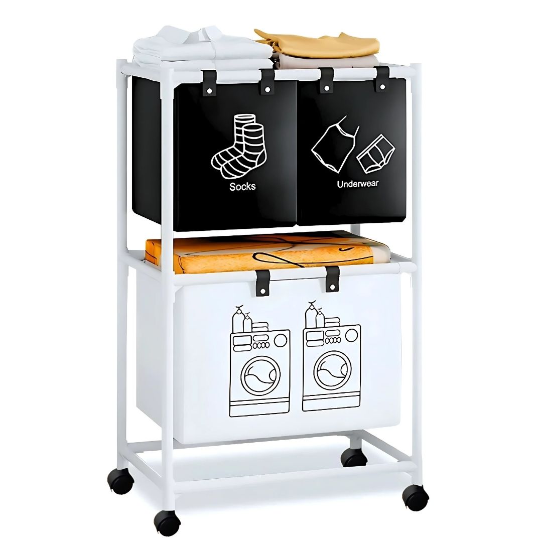 Cesto de Ropa 2 Niveles 3 Compartimientos para Lavandería con Ruedas 100x55x25cm