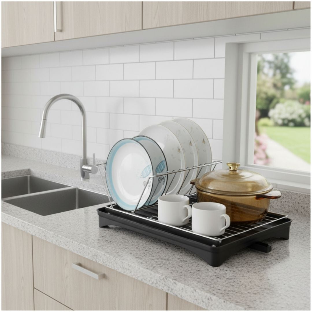 - Su estructura resistente permite colocar platos, tazas, ollas y utensilios con total seguridad, mientras que la bandeja inferior recoge el exceso de agua para mantener tu encimera limpia y seca.