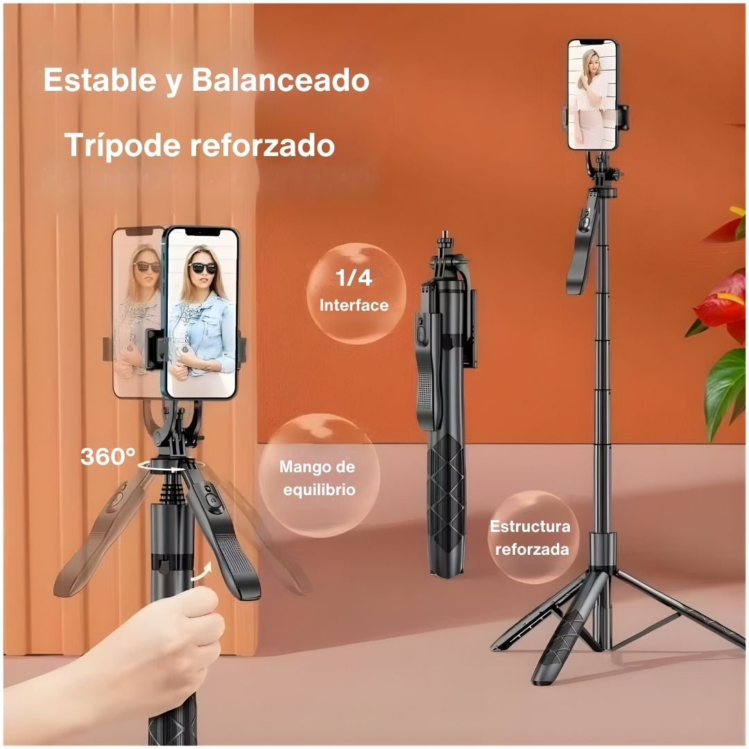 - Su diseño extensible y plegable permite usarlo tanto como palo para selfies como trípode de mesa o de piso, ofreciendo una experiencia práctica para grabaciones, transmisiones en vivo, videollamadas o sesiones de fotografía.