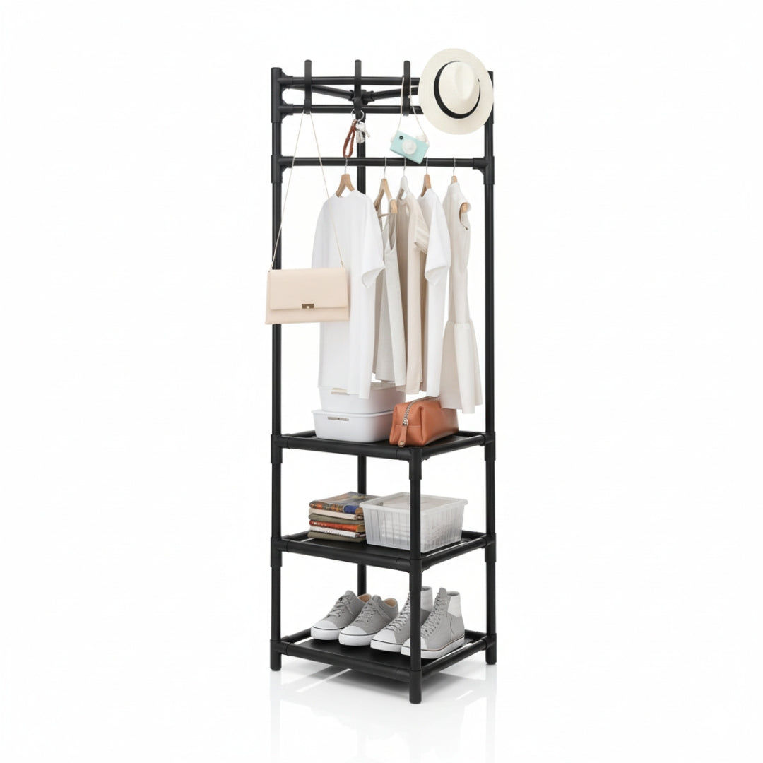- Con este maravilloso estante con colgadores podrás organizar ropa, zapatos, carteras, toallas, cajas y mucho más. Ahorrando así mucho espacio en tu hogar.