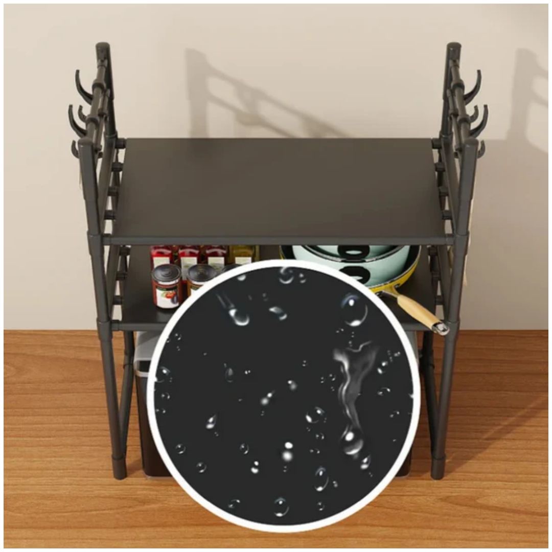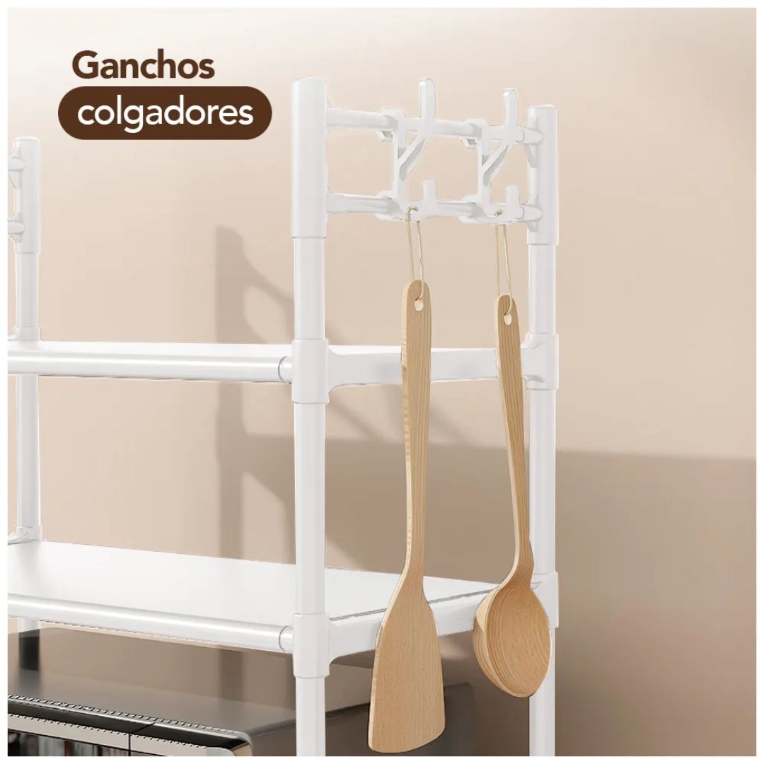 - Fabricado con plástico reforzado, ofrece una excelente capacidad de carga y gran estabilidad. Además, cuenta con ganchos laterales para colgar utensilios de cocina y una estructura resistente al agua y a la corrosión, lo que lo convierte en una solución práctica y duradera para el uso diario.