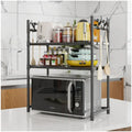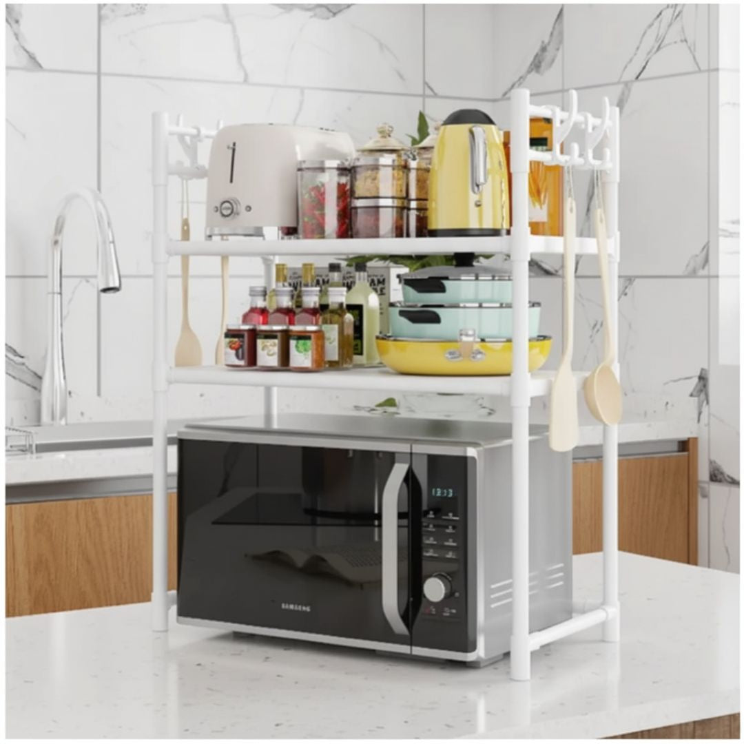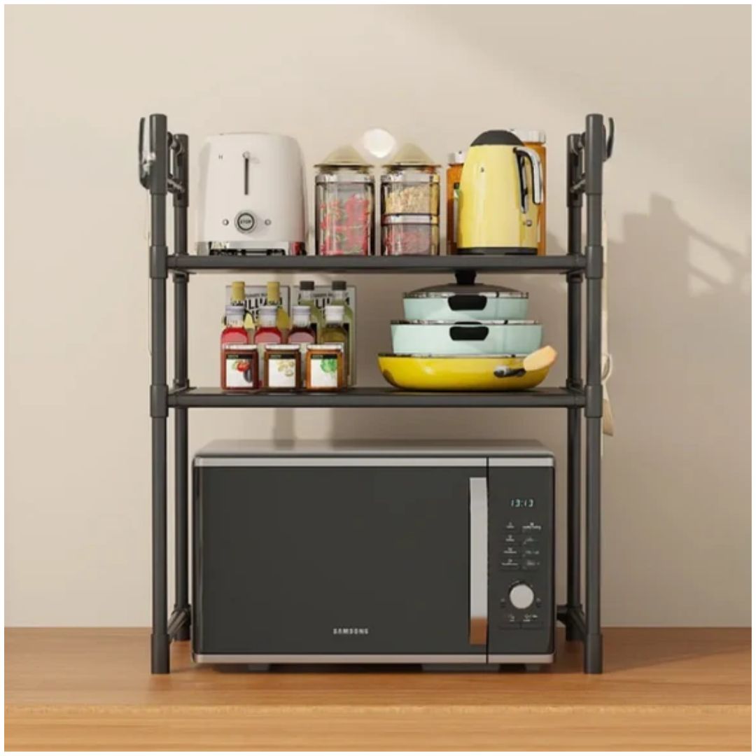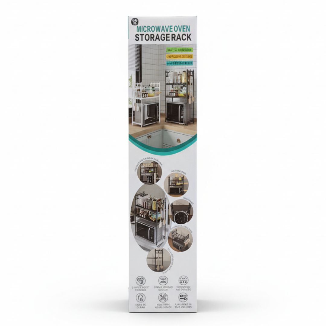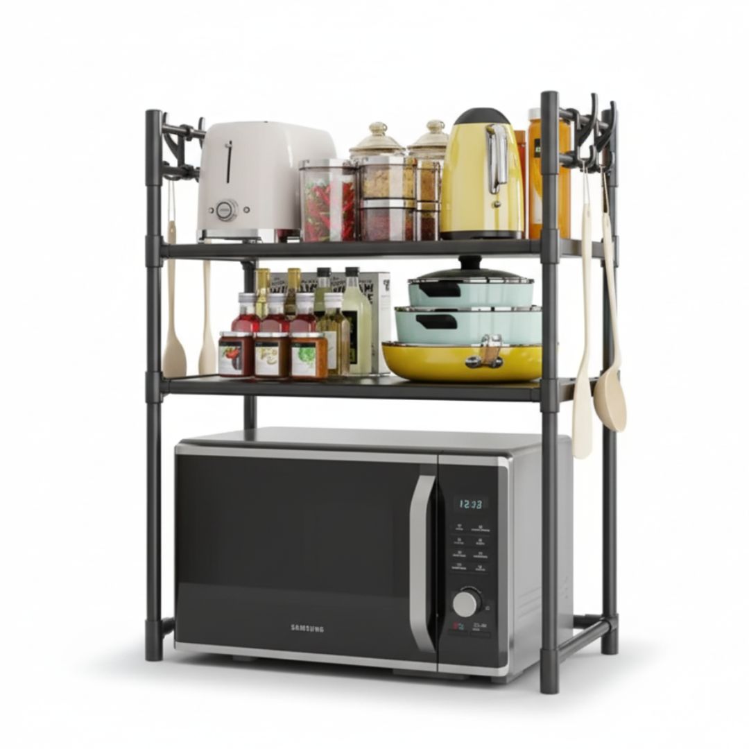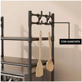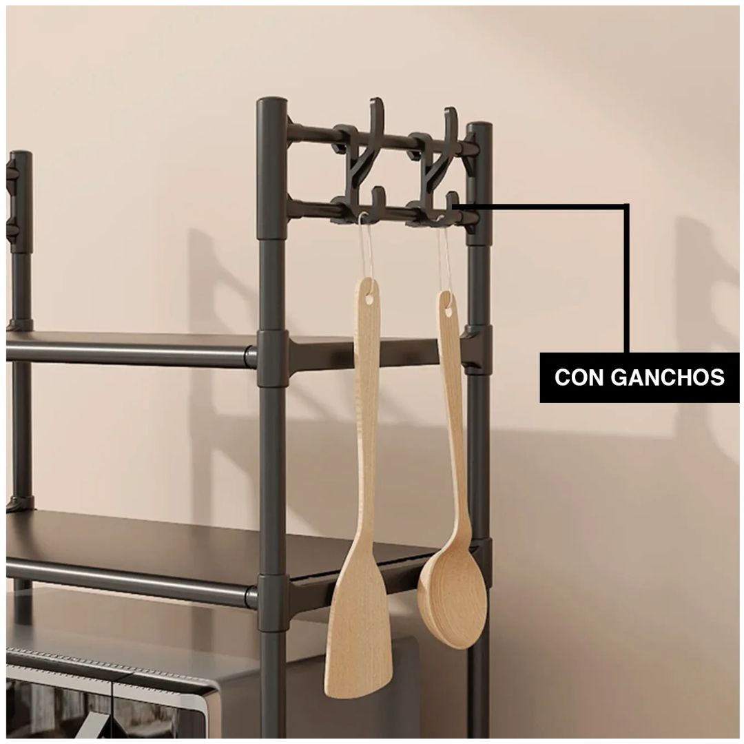- Su diseño multinivel permite colocar el microondas en la parte inferior y organizar especias, frascos, utensilios y pequeños electrodomésticos en los estantes superiores, optimizando el espacio de forma eficiente.