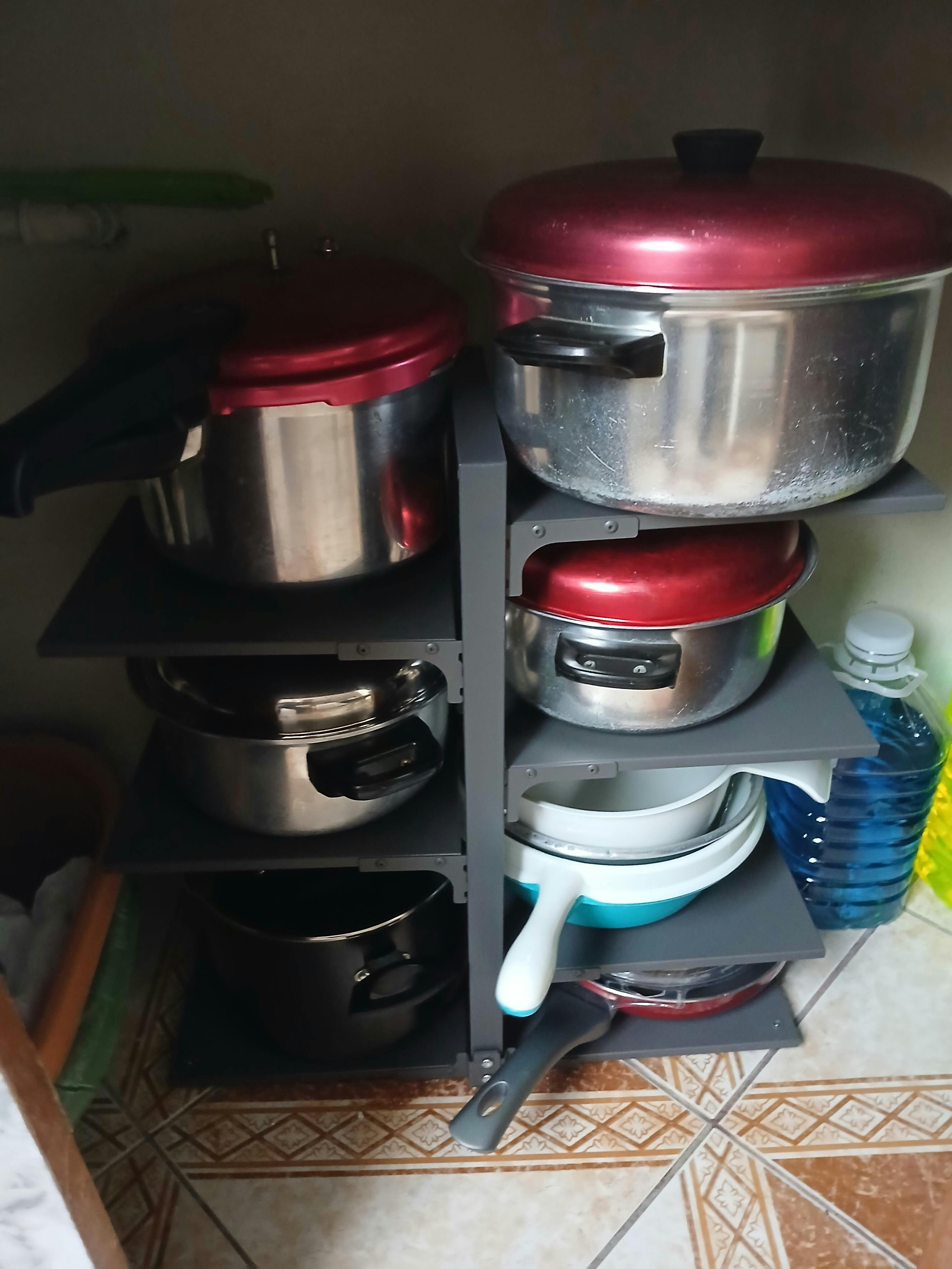 - Alta capacidad y ajustable: el diseño de varias capas del estante organizador de sartenes es suficiente para sostener ollas, sartenes y tapas, haciendo que tu cocina esté ordenada. El diseño de espaciado de capas ajustable se puede ajustar de acuerdo con la altura de ollas y sartenes. La parte inferior cuenta con 4 diseños de base pequeña giratoria y ajustable, lo que hace que este organizador de ollas sea capaz de manejar encimeras irregulares.