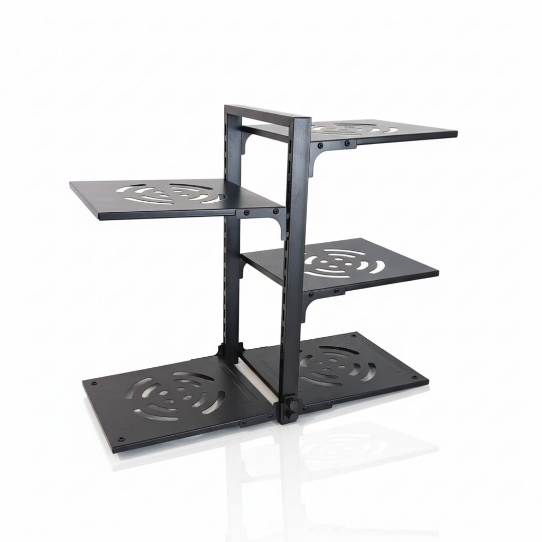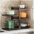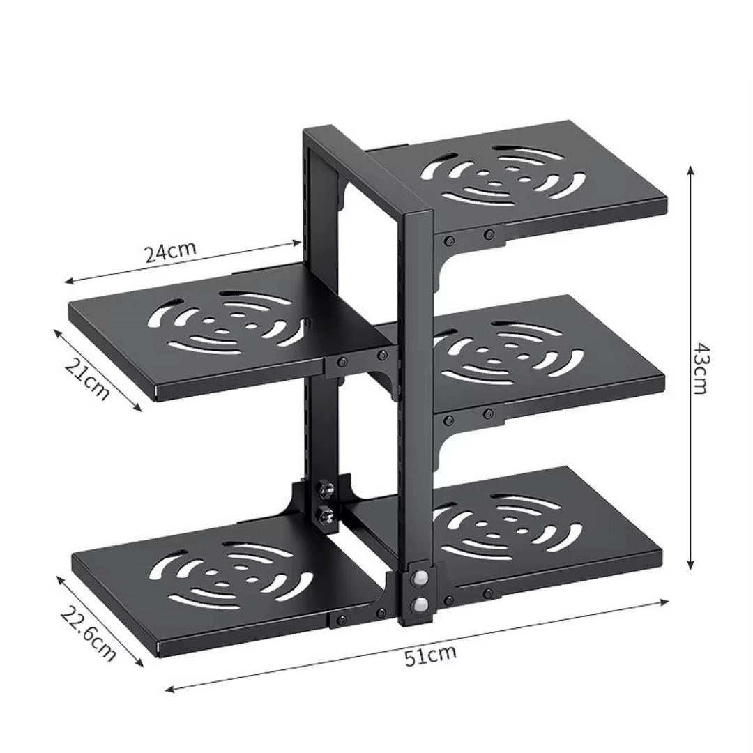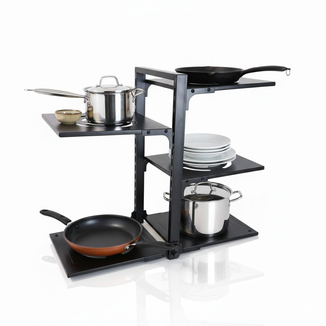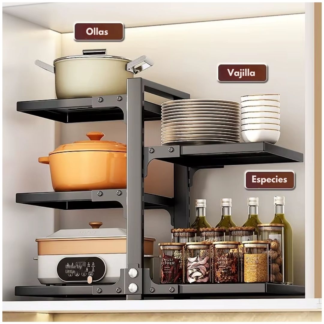 - Su diseño de múltiples niveles ajustables te permite organizar ollas, vajilla, frascos y especias de forma segura y ordenada.
