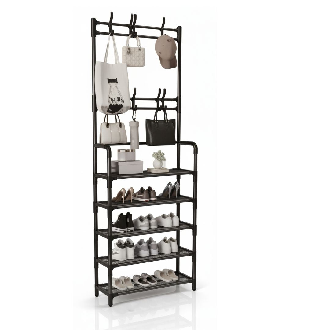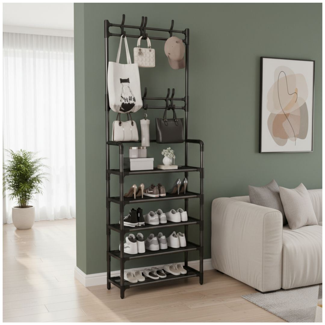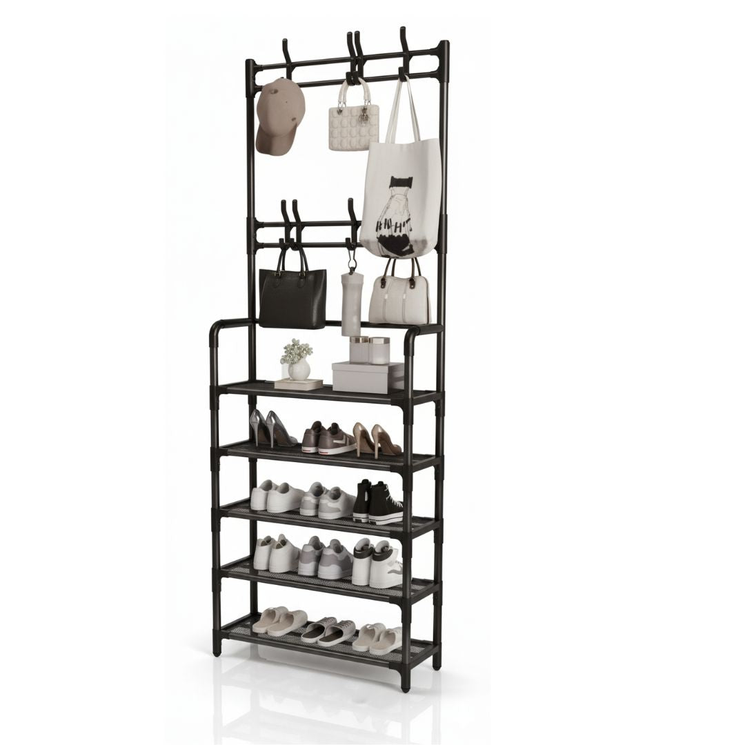 - Organizador de zapatos premium multiusos en color negro, sirve para colocar los zapatos dentro de sus 5 niveles. Es muy atractivo y llamativo debido a su color y estilo moderno.