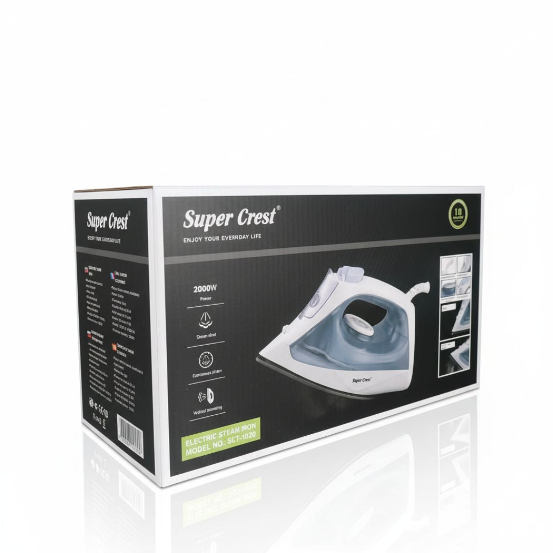 - La plancha a vapor eléctrica Super Crest SCT-1020 ofrece un rendimiento eficiente y confiable para el cuidado diario de tus prendas.