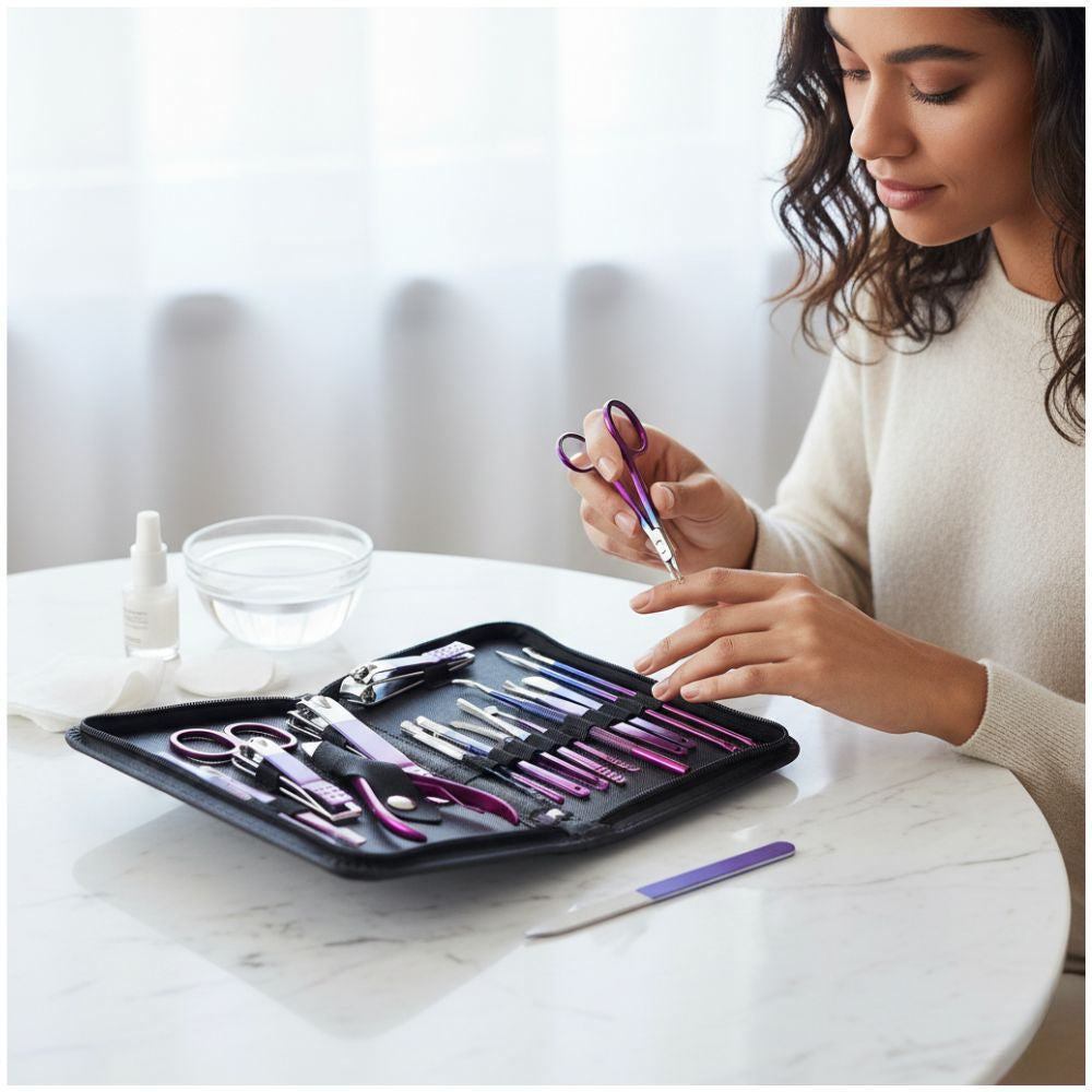 - Incluye: Cortaúñas de diferentes tamaños/Tijeras de precisión/Alicate para cutículas/Lima metálica/Empujadores y removedores de cutícula/Herramientas para limpieza facial