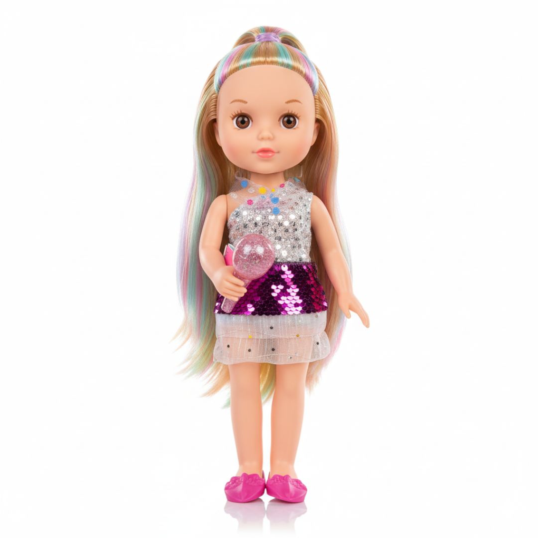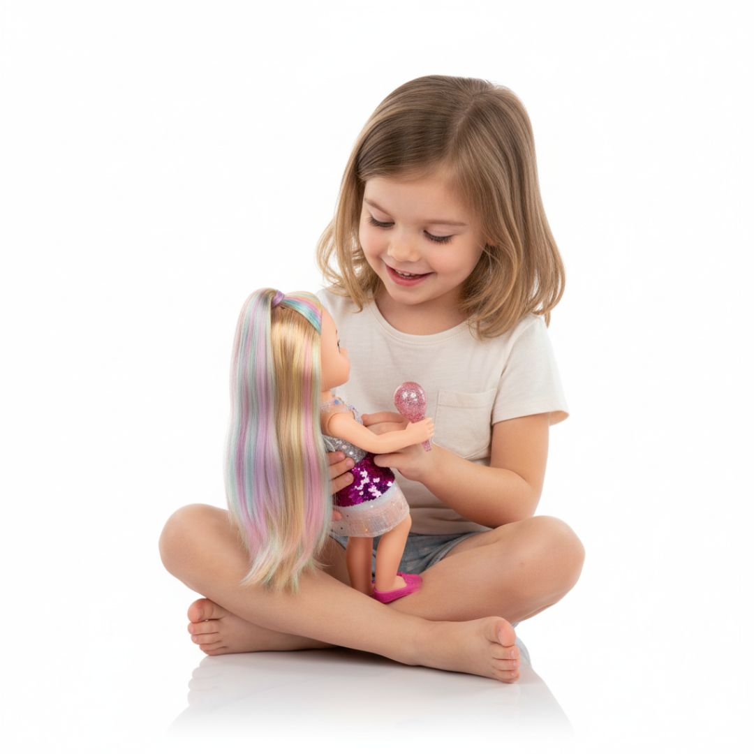 - Incluye: Muñeca cantante con vestido brillante y micrófono iluminado