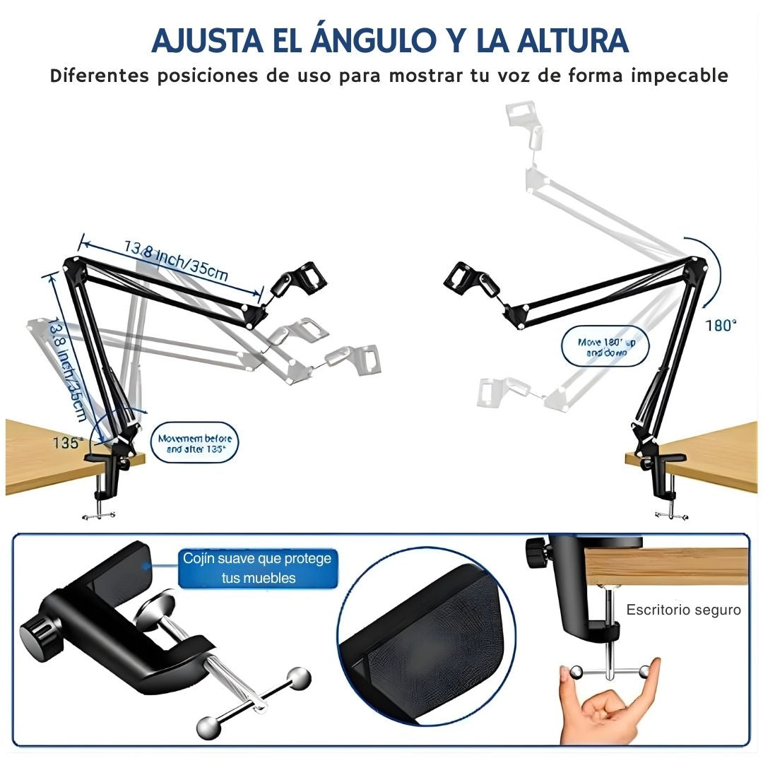- Este soporte profesional para micrófono tipo brazo articulado es una excelente opción para creadores de contenido, locutores, streamers y estudios de grabación en casa.