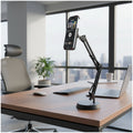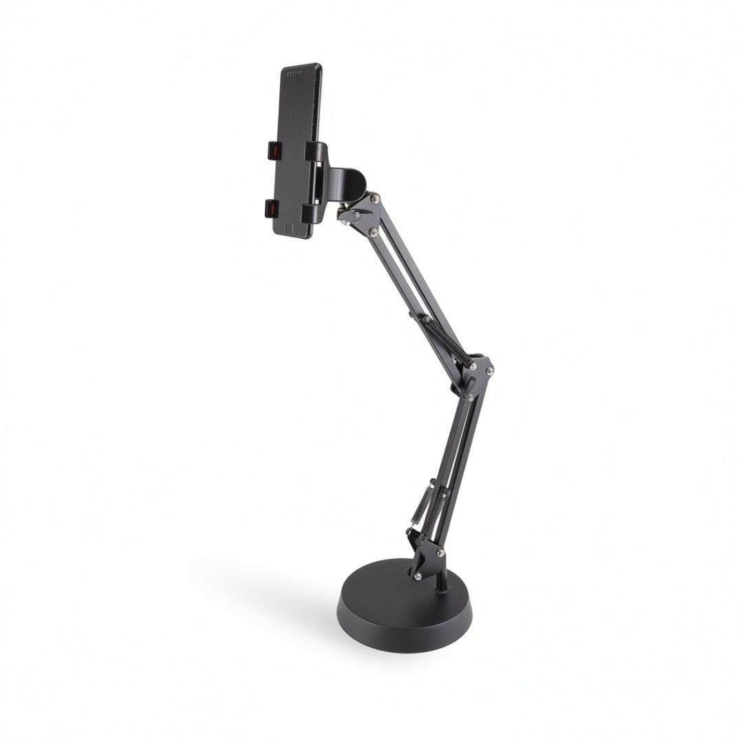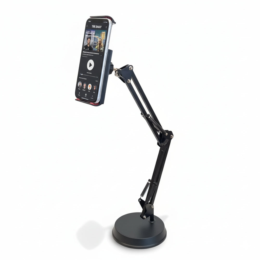 - Optimiza tu espacio de trabajo y crea contenido con mayor comodidad gracias a este soporte multifuncional de escritorio para celular, micrófono y cámara.